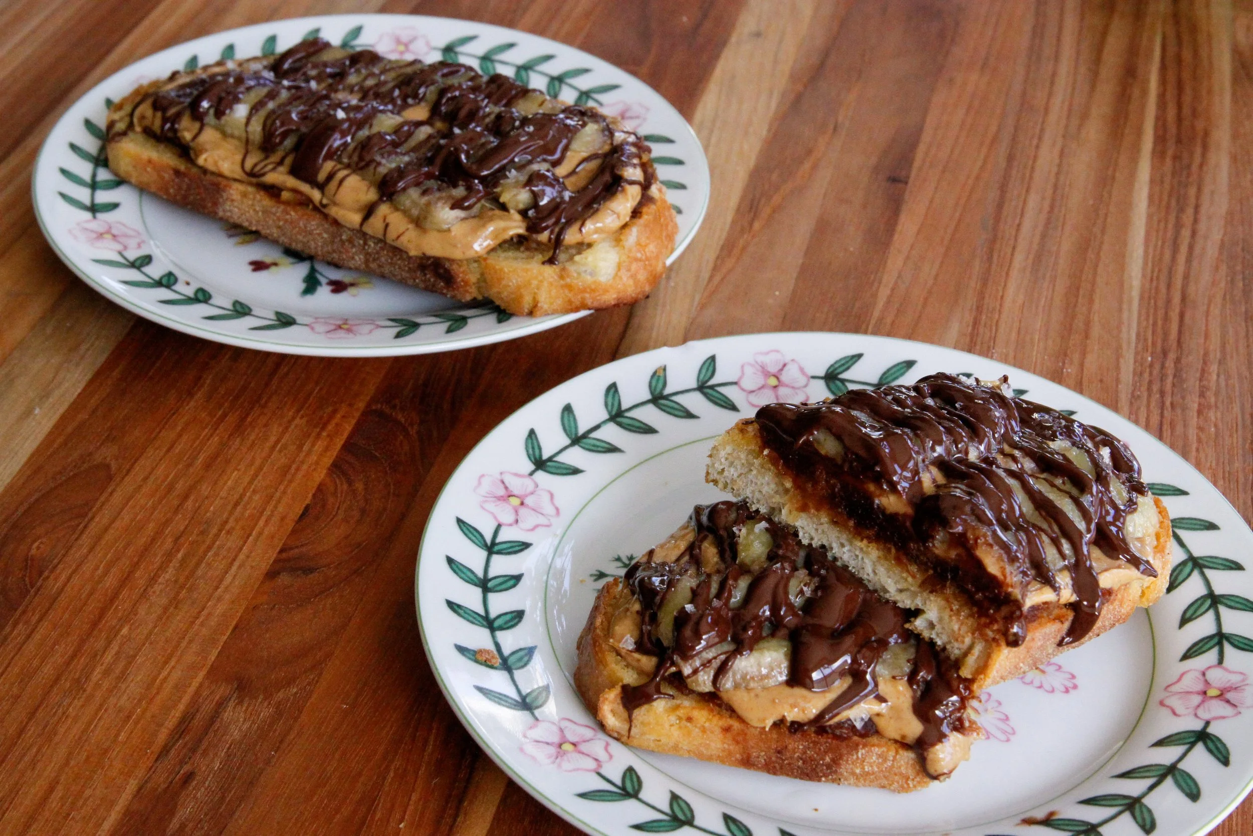 Add 3 dates to each slice of toast then use the back of a fork to mash and spread the dates out. Add a layer nut butter. Place half of the banana on each toast then top with a drizzle with melted chocolate and a sprinkle of sea salt.