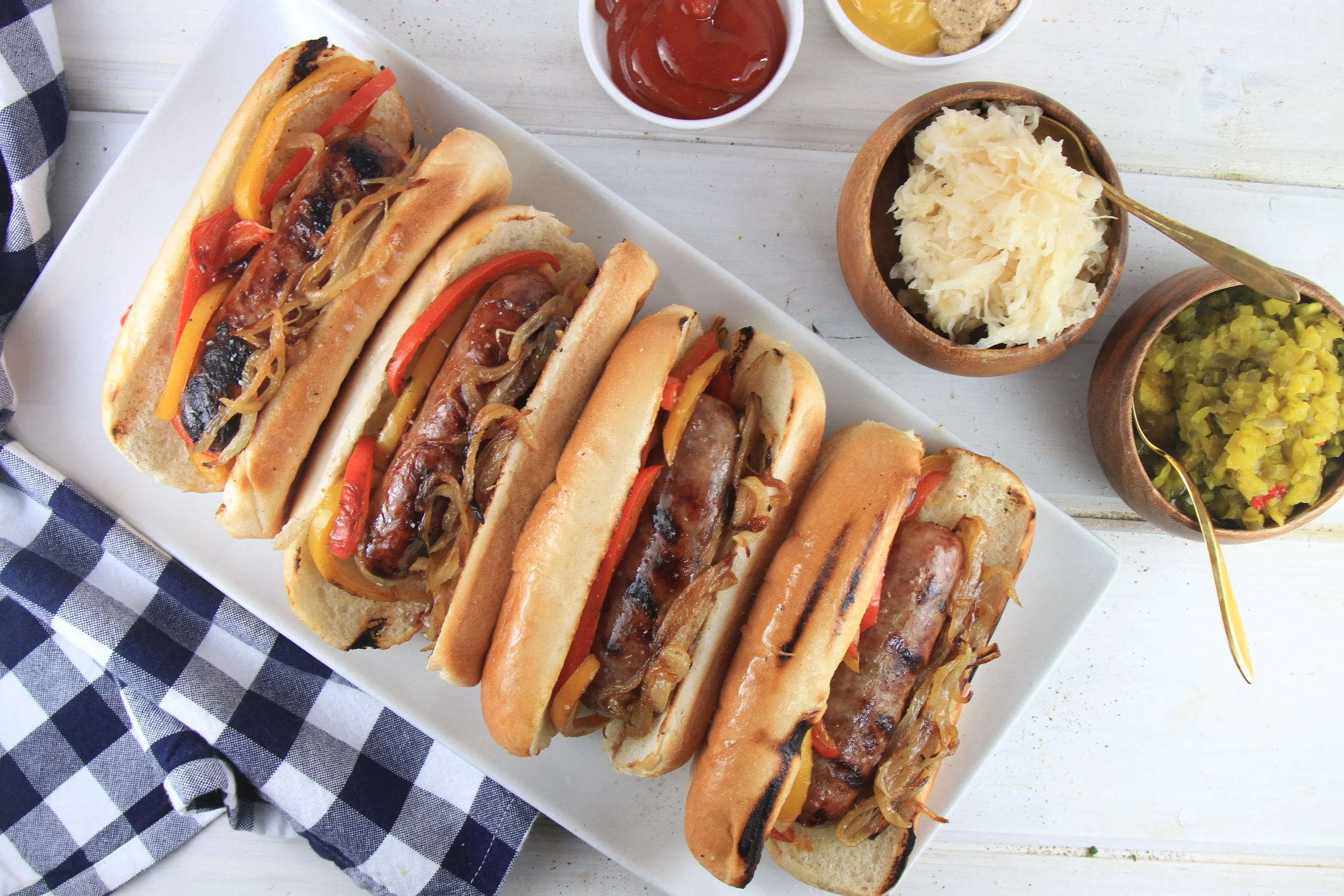 5. Enjoy the brats loaded with the sautéed onions and peppers, and an array of your favorite condiments.