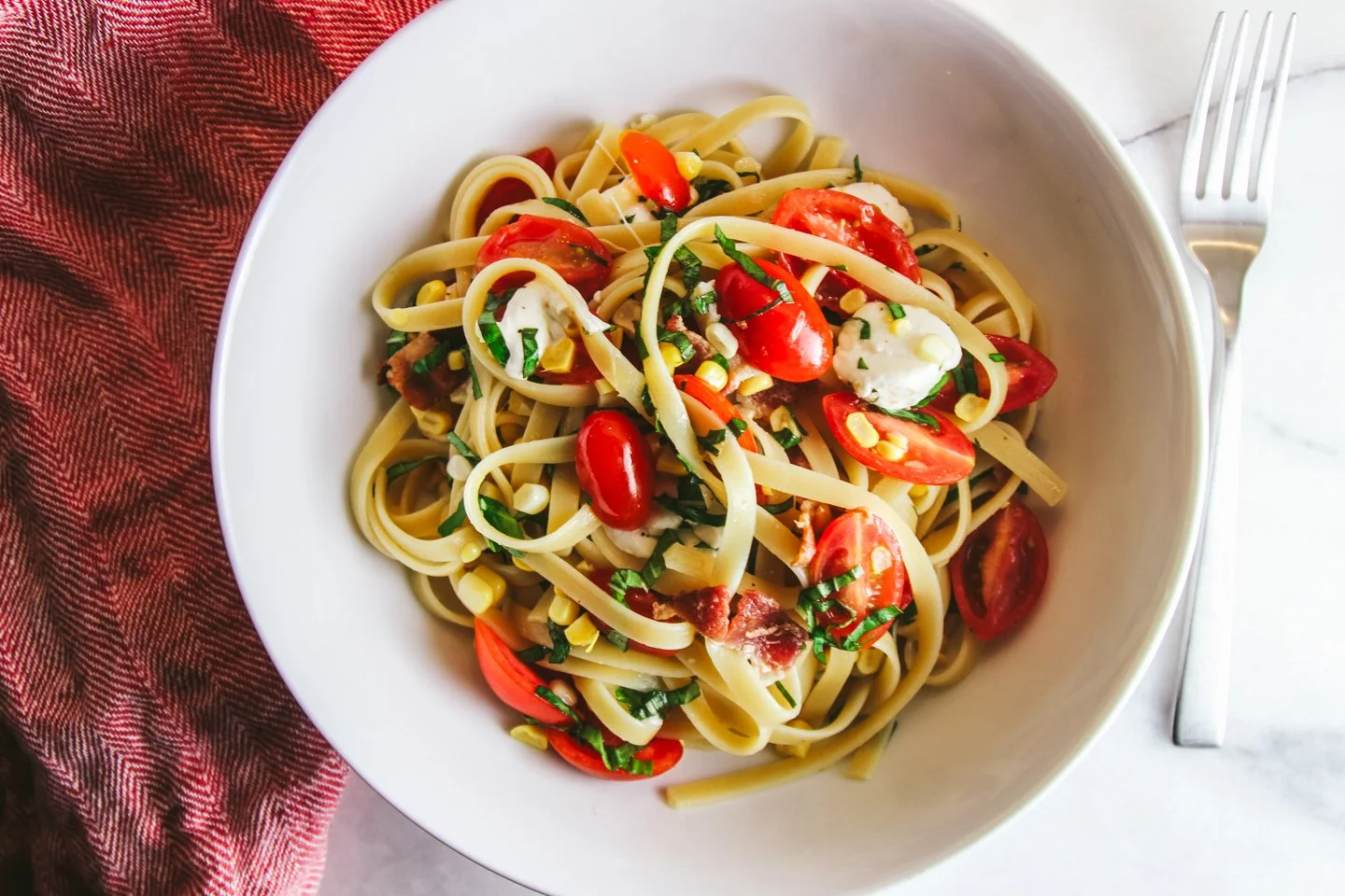 Enjoy peak summer flavor - make our Farmer's Market Pasta! Sweet corn, juicy tomatoes, and fresh basil come together in this simple, seasonal dish. Add in crispy, salty bacon and creamy mozzarella, and you’ve got the perfect balance of fresh and indulgent in every bite. Perfect for an easy weeknight and worthy enough for a dinner party.