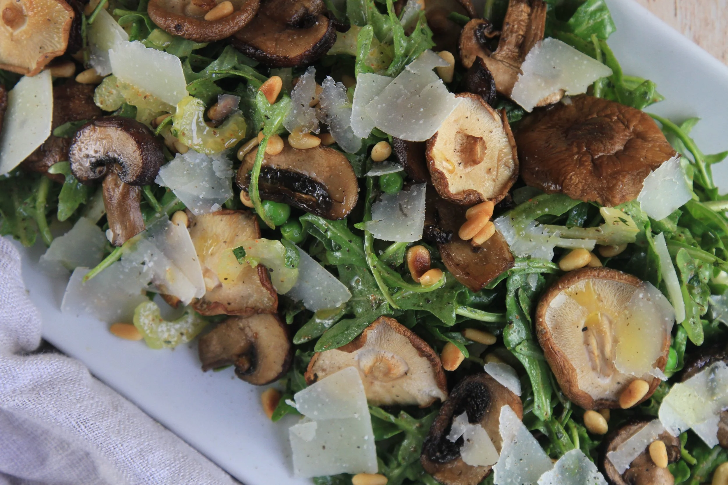 This salad is filled with rich, savory flavors! Earthy, grilled mushrooms absolutely shine when paired with bitter arugula, aromatic celery, and nutty grana padano cheese. Bright lemon flavors add a layer of piquancy, while the buttery pine nuts add a nice crunch. Your taste buds will be delighted and your hungry stomach satisfied.