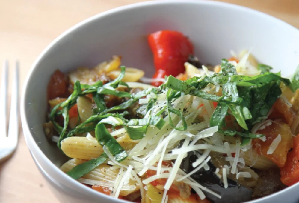 6. Once all vegetables are cooked, remove from the grill and add to the cooked pasta. Stir together, and serve hot with a garnish of Parmesan cheese, basil and a drizzle of olive oil.