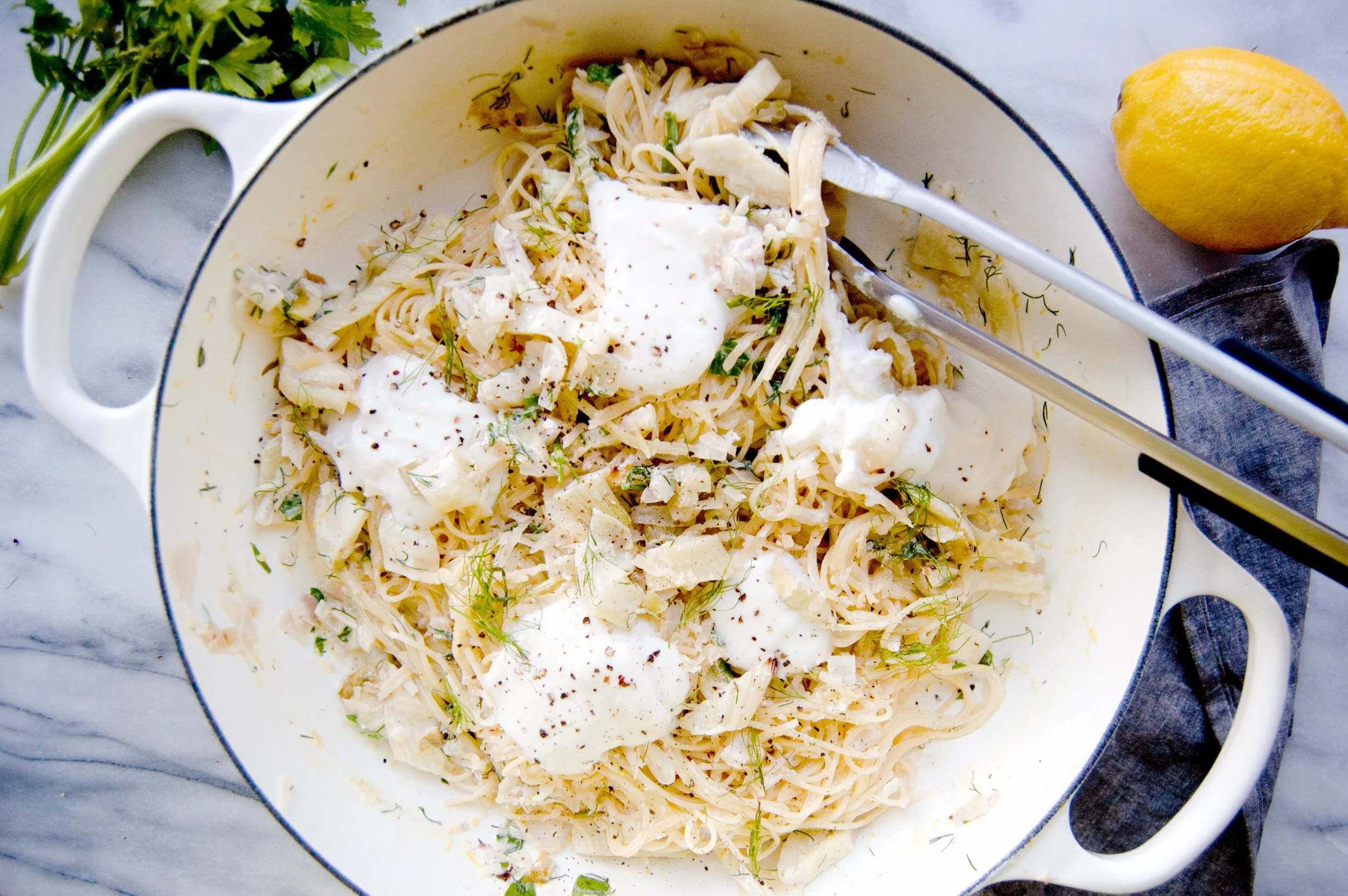 5. Salt and boil water and cook pasta until al dente. Use tongs to scoop pasta into sauce and combine until noodles are coated. Add more pasta water if needed and serve pasta with a generous dollop of ricotta, fresh dill, fennel fronds, and parmesan. Salt and pepper to taste.