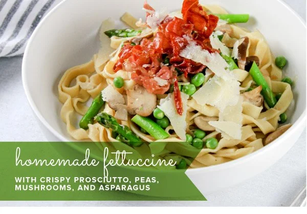 It's no secret -- pasta is universally loved! With a few key ingredients and handy kitchen tools, making primo pasta is easier than you think! The homemade pasta is adorned with spring asparagus, peas, and crispy prosciutto on top. Get ready to enjoy some fresh pasta and delightful flavors!